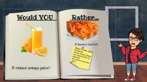I would have it snowed cheetoes because if it rains orange juice it would be all